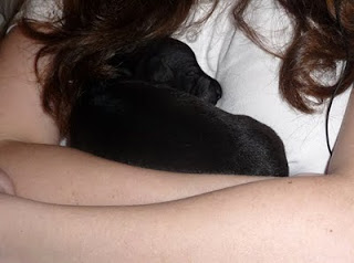 Det andra som hände är det som bilden visar. En av valparna, den förstfödde, somnade i min famn. Känslan jag upplevde när den la sig till rätta och borrade nosen i min tröja för att därefter sucka tungt och somna var så obeskrivlig. Glädje, ro, mys och spänning i en berusande blandning. Så här, tre timmar efter att det inträffade, är jag fortfarande hög på de känslorna. Någon stund senare gjorde även valpen med den stora vita fläcken det samma. Fram tills idag sprattlade alla valparna vilt när jag försökte få dem att somna i min famn. Jag kallade dem smekfullt för vildhundarna. Det är de inte längre.